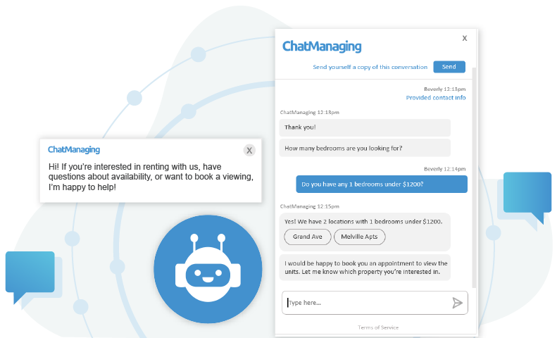 ChatManaging is a hybrid breed of bot — directing prospects through the conversation while providing the information they need and leading them to book a tour. ChatManaging constantly learns and adapts as unique conversations occur.